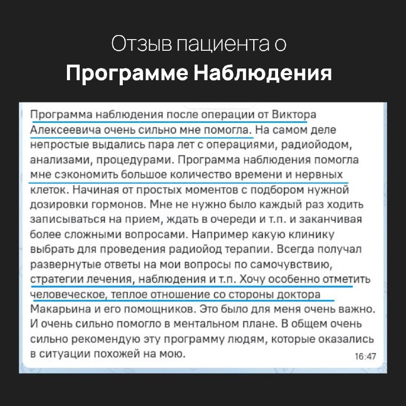 Когда после операции: — не нужно каждый раз искать, куда идти и что сдавать, — есть чёткое понимание плана наблюдения, — можно задать вопрос и получить ответ, — не остаёшься один со своими анализами и сомнениями. Именно так мои пациенты, те, кого я веду, описывают Программу Наблюдения.