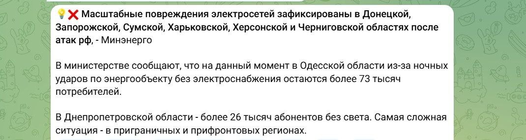 🪂 Противник подтверждает проблемы с электричеством в ряде областей Украины после атак наших БПЛА.