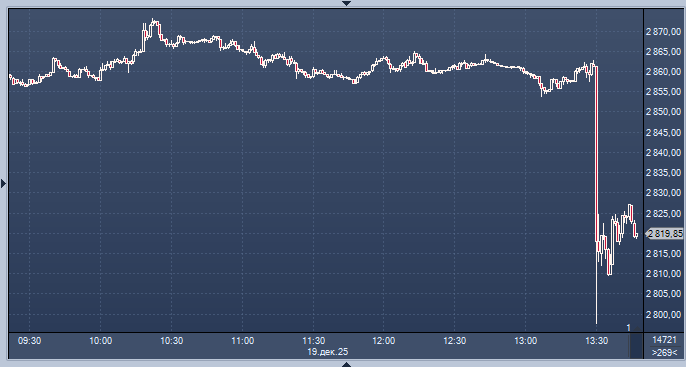 Рынок акций РФ отреагировал откатом на решение ЦБ снизить ставку на 0,5 п.п., индекс МосБиржи провалился ниже 2750п. Рубль немного укрепился, но реакции почти нет График фьючерса на индекс Мосбиржи интервалами в 1 минуту Российский рынок акций в пятницу, в середине дня, отреагировал на снижение ключевой ставки Центрального банка России на 0,5 процентного пункта до 16% годовых распродажами. Индекс МосБиржи потерял весь утренний рост и опустился ниже 2750 пунктов. К полудню индекс МосБиржи снизился до 2748,11 пункта (-0,2%), индекс РТС — до 1081,73 пункта (-0,2%). Цены на большинство "голубых фишек" на Московской бирже снизились на 0,5-1,5%. По прогнозам ЦБ РФ, инфляция в России по итогам 2025 года составит менее 6% (ранее ожидалось, что цены вырастут на 6,5-7%). В 2026 году регулятор прогнозирует инфляцию на уровне 4-5%. ЦБ считает, что российская экономика отклоняется от траектории сбалансированного роста все меньше. Кроме того, ЦБ РФ подчеркнул, что для возвращения инфляции к целевому