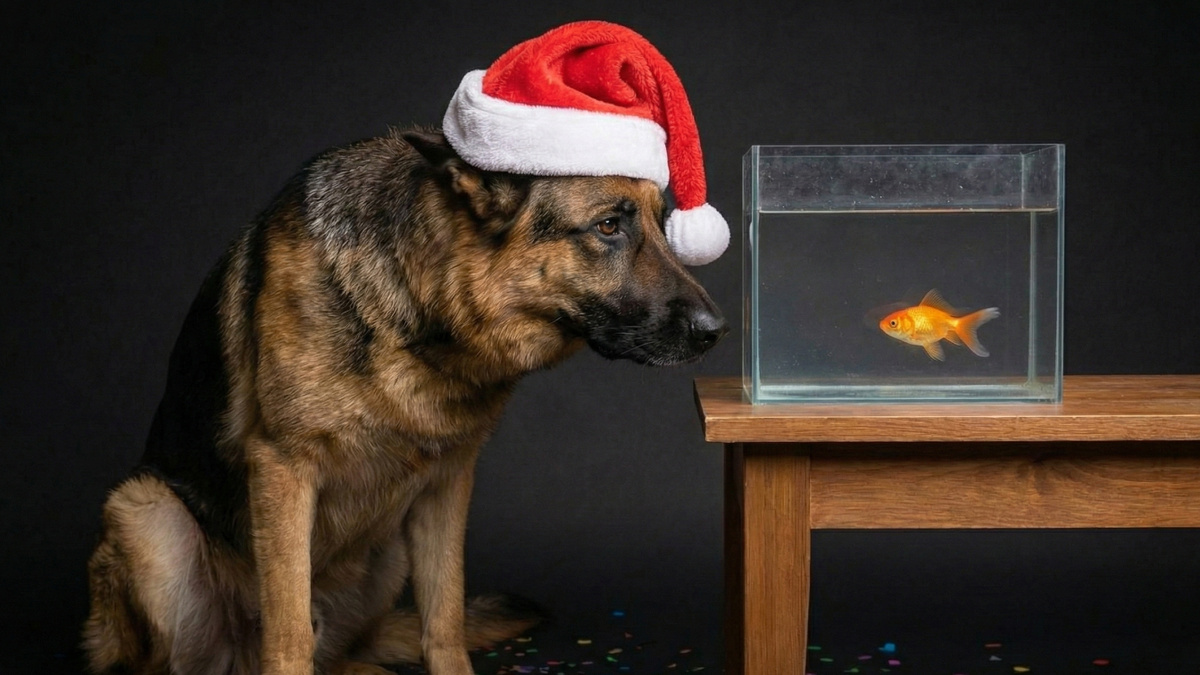 Почему эта большая овчарка сидит в одиночестве у аквариума, а не вокруг салата и не под оливье?