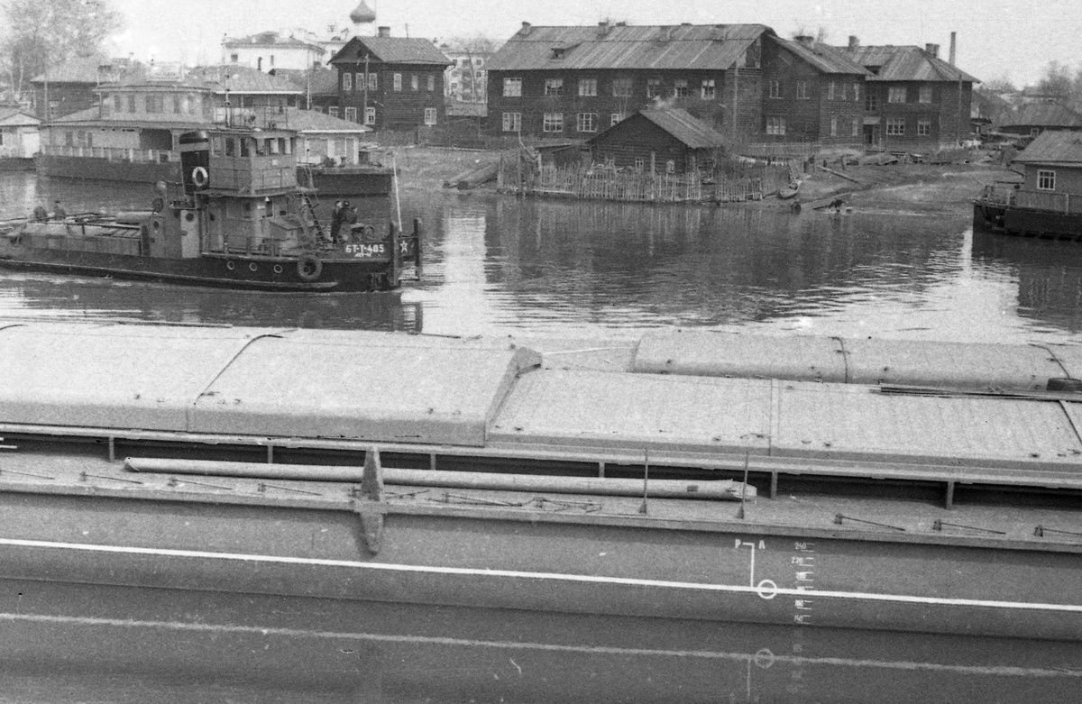 Над крышами домов виднеется купол церкви Андрея Первозванного на Набережной 6 Армии. У берега стоят пристани.