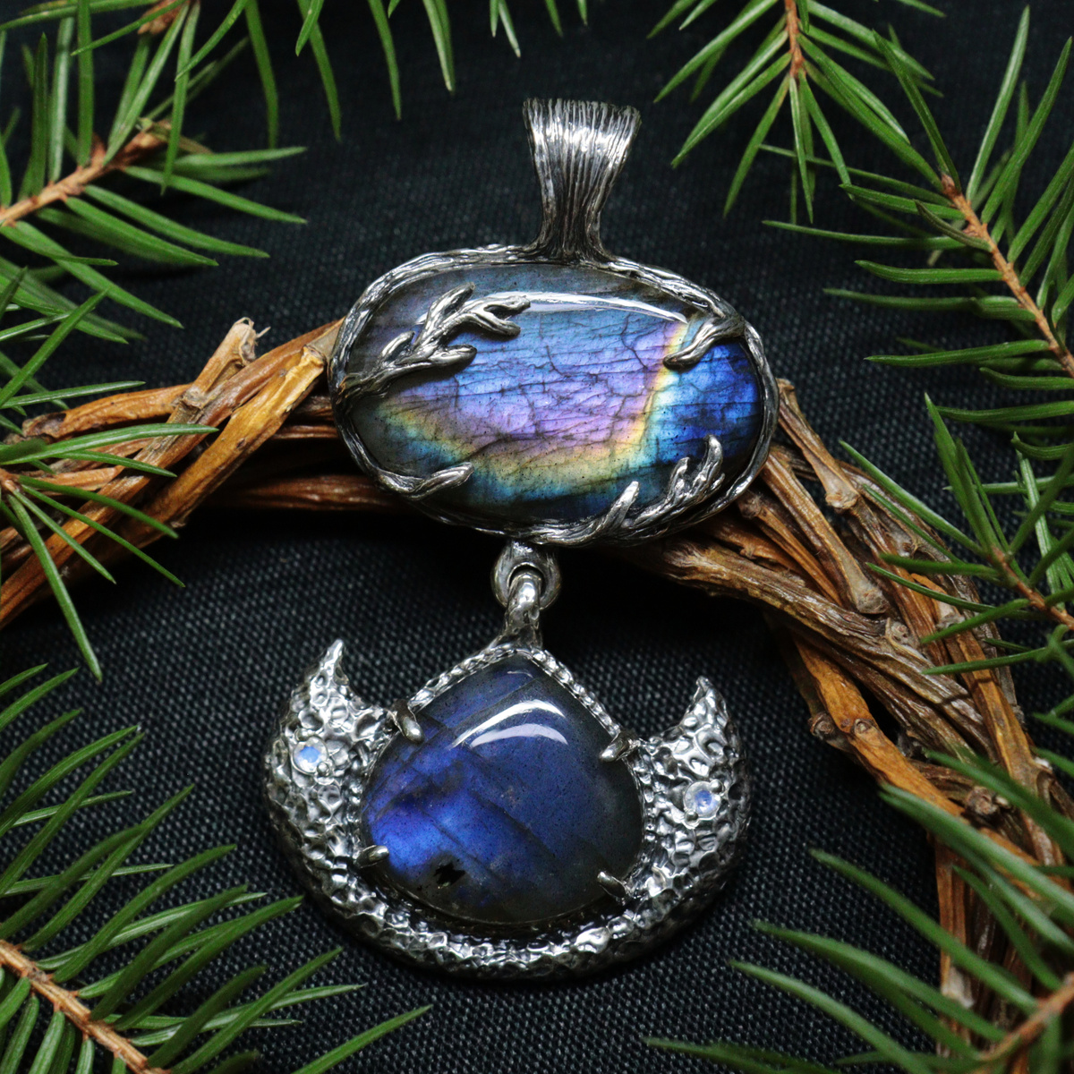 Верхняя часть кулона - овальный лабрадор с фиолетовой, синей и радужной иризацией. Камень оплетают серебряные ветви с фактурой древесной коры, они не скрывают его красоту, а наоборот, обрамляют и подчеркивают. Нижняя часть присоединена подвижно на петельку, что делает кулон таким живым и динамичным. Она выполнена в виде полумесяца с каплей лабрадора синего оттенка по центру. По краям переливаются небольшие лунные камни. Фактура "лунная поверхность" добавляет полумесяцу особое очарование.
