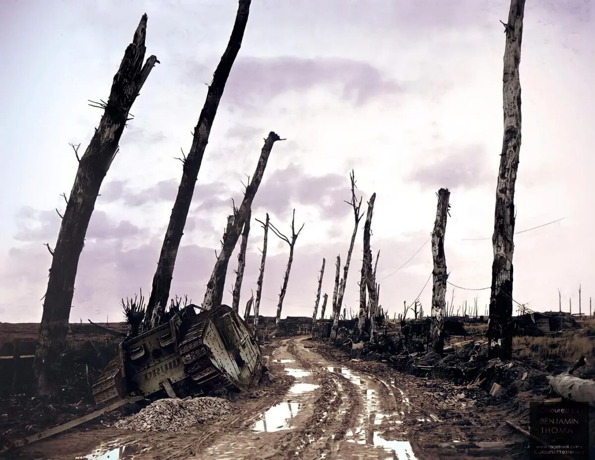 Брошенный британский танк Mark IV на дороге, 19 декабря 1918 года