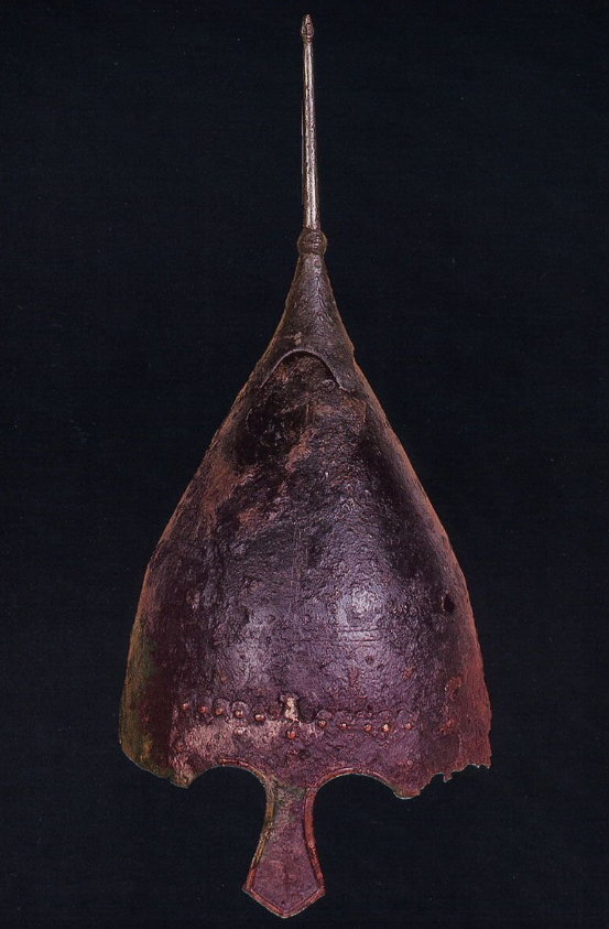 Ещё одна деталь: у шлема отсутствовала кольчужная бармица. Зато рядом находился кольчужный капюшон — элемент защиты, который начал широко применяться в империи Чингизидов после вторжения в Европу в XIII веке. Его плоские кольца с бортиками также были покрыты медью.
