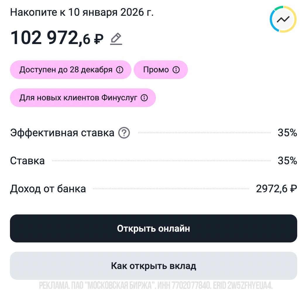 У меня появились свободные 30 тысяч. Хотел инвестировать во что-нибудь интересное рамках Альтернативного портфеля. И неожиданно узнал, что прямо сейчас на Финуслугах можно открыть вклад под 35%! Немедленно воспользовался! Предложение ограничено, такой вклад можно открыть только до 28 декабря. И сумма тоже ограничена, до 100 тысяч. Но грех же не воспользоваться! Делюсь этой возможностью и с вами. Если у вас припаркована финансовая подушка, странно пропустить такую возможность. Почти 3% за месяц на ровном месте без рисков вообще. Вот ссылка на открытие вклада, чтобы получать повышенную доходность вместе со мной. Нужно обязательно открывать через кабинет Финуслуг, только там такое предложение. Это проект Мосбиржи, так что смело авторизуйтесь через Госуслуги. Ну и заодно, аккаунт там заведете: там бывают интересные предложения. А я вложил свои 30 тысяч рублей, считаем это новой инвестицией в рамках Альтернативного портфеля. В январе они вернутся с процентами и пристроим куда-то на подольш