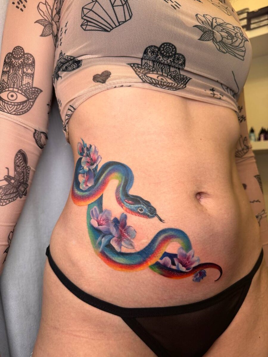 Вот так вот у нас продвигаются дела, половина татуировки ещё заживает, опух шрамик сильне, тк сегодня на ней делали татуировку. Зафиналим после полного заживления, прорисую чуть больше деталей, чешуи