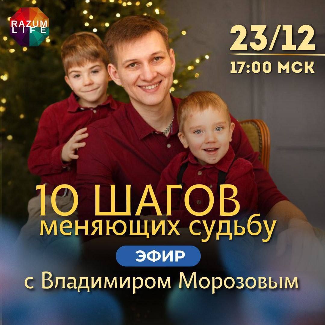 ! Задумывались ли вы о том, что наша жизнь – это плод наших же поступков, мыслей, слов? Словно семена, посаженные в почву, в свой срок они дают урожай. Если мы хотим изменить свою жизнь к лучшему, то нам нужно начать сеять другие семена! О том, что и как мы можем поменять в нашей жизни, поговорим в 🤩🤩🤩🤩🤩🤩🤩🤩 ПРЯМОМ ЭФИРЕ с ВЛАДИМИРОМ МОРОЗОВЫМ 1⃣0⃣ 😝😀😁😉😄🥳 🟤🟤🟤🟤🟤🟤🟤🟤 🟤🟤🟤🟤🟤🟤 🤩🤩🤩🤩🤩🤩🤩🤩 2⃣3⃣ декабря 17:00 мск На встрече вы узнаете: ✅как прямо сейчас начать творить свою счастливую судьбу; ✅как привлечь процветание в свою семью; ✅как улучшить отношения в семье и с окружающими. Владимир Морозов – ученик Александра Хакимова и Марины Таргаковой. Режиссер, продюсер, разумный педагог, специалист в области межличностной психологии, ведущий тренингов и семинаров. Вместе с супругой Натальей воспитывает 5х сыновей, двое из которых «р