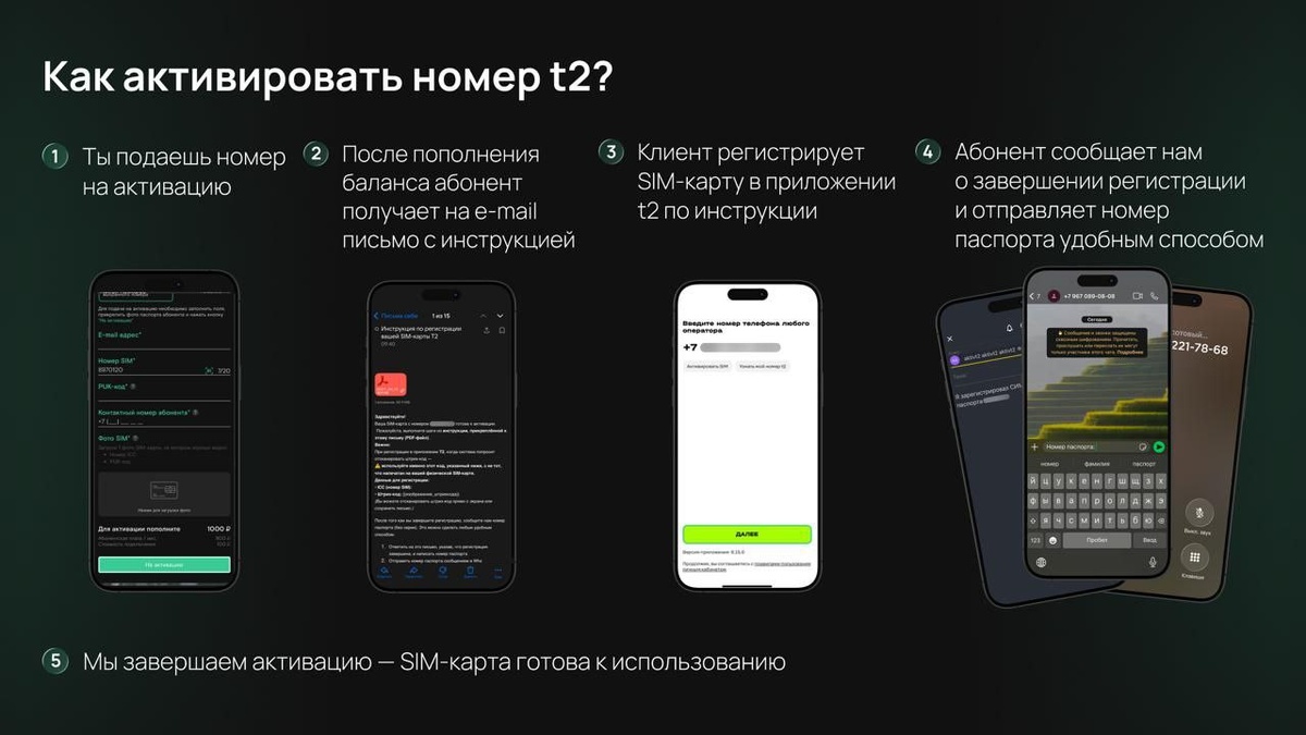 ? Мы проанализировали популярные обращения и увидели, что один из самых частых вопросов — активация SIM-карт t2. Чтобы сделать подключение клиентов для тебя максимально простым и понятным, мы подготовили короткий гайд по активации SIM-карты этого оператора. 👆На картинке выше ты найдешь визуальную схему «Путь клиента» — она наглядно показывает весь процесс: от покупки SIM-карты до ее полного подключения. Вот коротко, как активировать номер t2: 1️⃣ Ты подаешь номер на активацию. 2️⃣ После пополнения баланса абонент получает на e-mail письмо с инструкцией. 3️⃣ Клиент регистрирует SIM-карту в приложении t2 по инструкции. 4️⃣ Абонент сообщает нам о завершении регистрации и отправляет номер паспорта. 5️⃣ Мы завершаем активацию — SIM-карта готова к использованию. Ориентируйся на эту схему при активации номеров — так все пройдет быстро и без лишних вопросов 👌