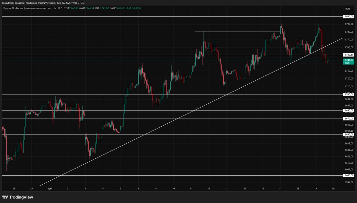 ? 💯 Сегодня, на решении по ставке рынок дал нисходящее движение, о чем мы и говорили ранее. В итоге закрылся индекс под 2750, красной, шортовой свечой, что само собой является слабостью. Плюсом под Новый год начинается новостное затишье, а значит пропадает условный драйвер для роста. Следовательно поэтому сразу вывожу, что в ближайшее время жду падение по индексу в сторону 2720 - 30, а там дальше будем смотреть по факту. ✅ Сегодня по плану был шорт и этот план очень даже хорошо отработал. На понедельник предварительно тоже будем смотреть в сторону шорта, но как всегда более подробно буду писать уже ближе к факту. Всем хороших выходных! 🤝