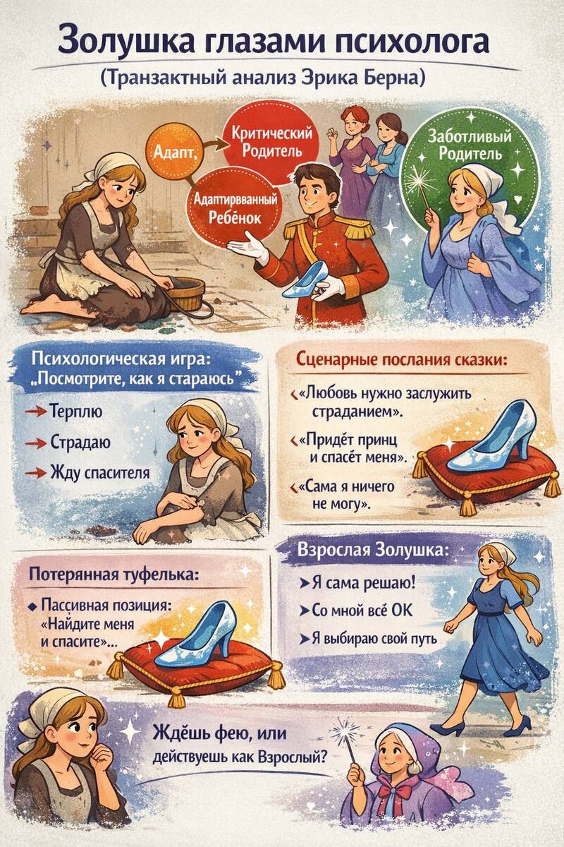 Почему эта сказка до сих пор так цепляет взрослых людей? Если разобрать её языком транзактного анализа, она перестаёт быть «про чудо» — и становится историей о жизненном сценарии. 🔺 Эго-состояния героев Золушка • В начале сказки — ярко выраженный Адаптивный Ребёнок. Она терпит, подстраивается, молчит, старается «быть хорошей», надеясь, что когда-нибудь её заметят и оценят. • Её внутренняя установка: «Если я буду стараться и терпеть, меня полюбят». Мачеха • Жёсткий Критический Родитель. Постоянные обесценивание, контроль, лишение ресурсов. • Транслируемое послание: «Ты недостаточно хороша» и «Твое место — внизу». Сводные сёстры • Колеблются между Адаптивный Ребёнком и Критическим Родителем, копируя стиль матери. • Они не автономны, а просто воспроизводят семейный сценарий. Фея-крёстная • Важный момент: это внешний Заботливый Родитель, а не внутренняя часть Золушки. Помощь приходит не изнутри, а извне — как «разрешение на счастье». Принц • Почти лишён психологической глубины. Он —