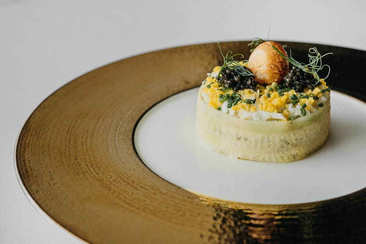Бренд-шеф ресторана Savva, Андрей Шмаков #рецепт #новогодниеправилашефа Салат подается с «золотым» яйцом, черной икрой и кремом на основе тресковой икры. Шеф-повар выкладывает ингредиенты слоями, оборачивает салат слайсом из огурца. Сверху украшает яйцом и выкладывает черную икру. Ингредиенты (4-5 порций): Картофель отварной — 2 шт. среднего размера Соус из крема трески — 70 г Майонез — 70 г Лосось горячего копчения — 120 г Морковь отварная — 2 шт. среднего размера Огурец без кожицы — 3 шт. Яйцо — 5 шт. Икра (на украшение) — 5 г Соус из крема трески: Икра трески — 45 г Белый хлеб — 2 ломтика Яйцо — 1 шт. Растительное масло — 50 мл Лимонный сок — 2 ч.л. Приготовление Отварить все ингредиенты: картофель, морковь и яйца. Затем нарезать кубиками по отдельности. Для соуса из крема трески в блендере смешать икру трески, ломтики белого хлеба без корок, целое сырое яйцо, растительное масло, две чайных ложки лимонного сока. По вкусу добавить соль. Все ингредиенты пробить в блендере до одн