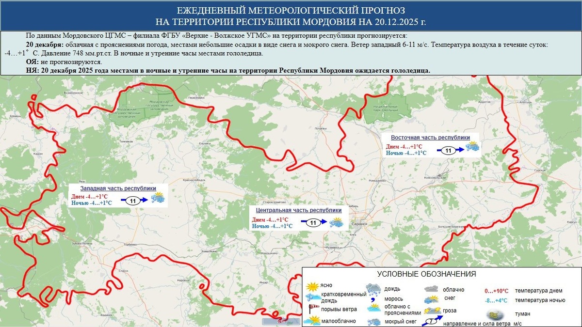 ☁️⛅⛈️ 20 декабря в Мордовии облачная с прояснениями погода, местами небольшие осадки в виде снега и мокрого снега
