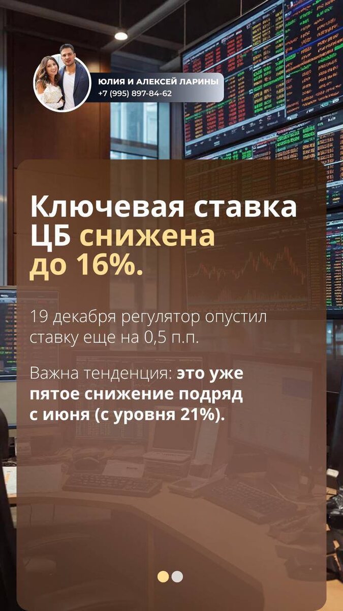 % 19 декабря, на финальном заседании года, Совет директоров Банка России принял решение снизить ключевую ставку на 0,5 п.п. — до 16% годовых. Несмотря на то, что корректировка кажется косметической, важна последовательность – ведь с июня месяца это уже пятое подряд снижение ставки – с 21% до 16%. Пик жесткости пройден, инфляционное давление снижается, и экономика готова к постепенному смягчению условий. Мы переходим от фазы «закручивания гаек» к стабилизации. Если вы откладывали решение квартирного вопроса по причине высоких ставок по ипотеке, сейчас самое время вернуться к обсуждению. Свяжитесь со мной, и мы просчитаем стратегию покупки с учетом новых экономических реалий. +79958978462