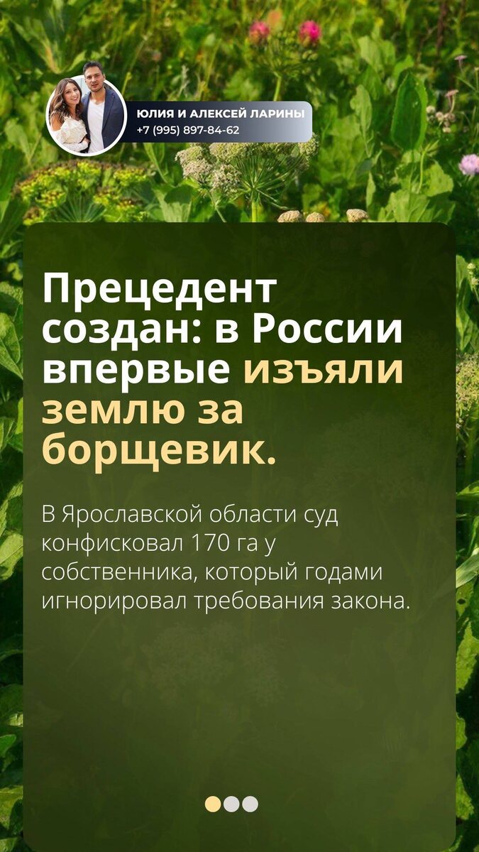 В России зафиксирован первый случай изъятия земельного участка из-за зарастания борщевиком. В Ярославской области суд постановил конфисковать 170 гектаров земли у собственника, который годами игнорировал требования законодательства. Ситуация стала возможной благодаря новому законодательству. Напоминаю, что с 1 марта 2025 года действует Федеральный закон №307-ФЗ, который регламентирует изъятие участков за нецелевое использование или отсутствие освоения. Считаю, что это жесткая, но ожидаемая мера. Собственность — это ответственность. Для нас всех это сигнал, что при покупке участка нужно тщательно проверять предписания и штрафы. Если вы планируете покупку земельного участка и хотите быть уверены в чистоте сделки и отсутствии скрытых проблем, обращайтесь ко мне за профессиональной консультацией. +79958978462
