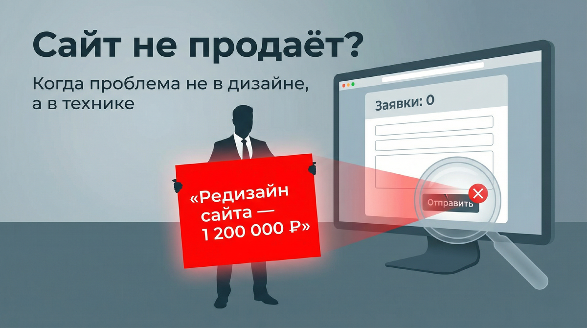 "Наш сайт просто не работает на продажи. Нужно полностью переделывать дизайн, менять структуру, переписывать все тексты". Директор по маркетингу B2B-компании по производству промышленного оборудования Игорь Малинин был уверен, что знает корень проблемы. Сайт получал трафик из контекстной рекламы, люди заходили, но заявок почти не было. Конверсия составляла жалкие ноль целых три десятых процента вместо нормальных для отрасли двух-трех процентов. Компания уже согласовала бюджет на редизайн в миллион двести тысяч рублей, когда случайная техническая проверка открыла совершенно другую правду о том, почему сайт действительно не продавал.