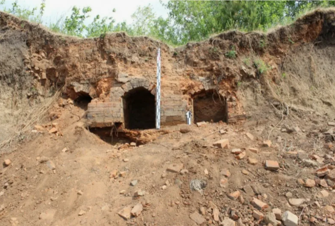 Арочные своды — это печи для обжига кирпича, стандартная для своего времени конструкция, которая отлично объясняет и форму, и материал, и расположение прямо у реки, потому что глина, вода и транспортировка всегда находились рядом.