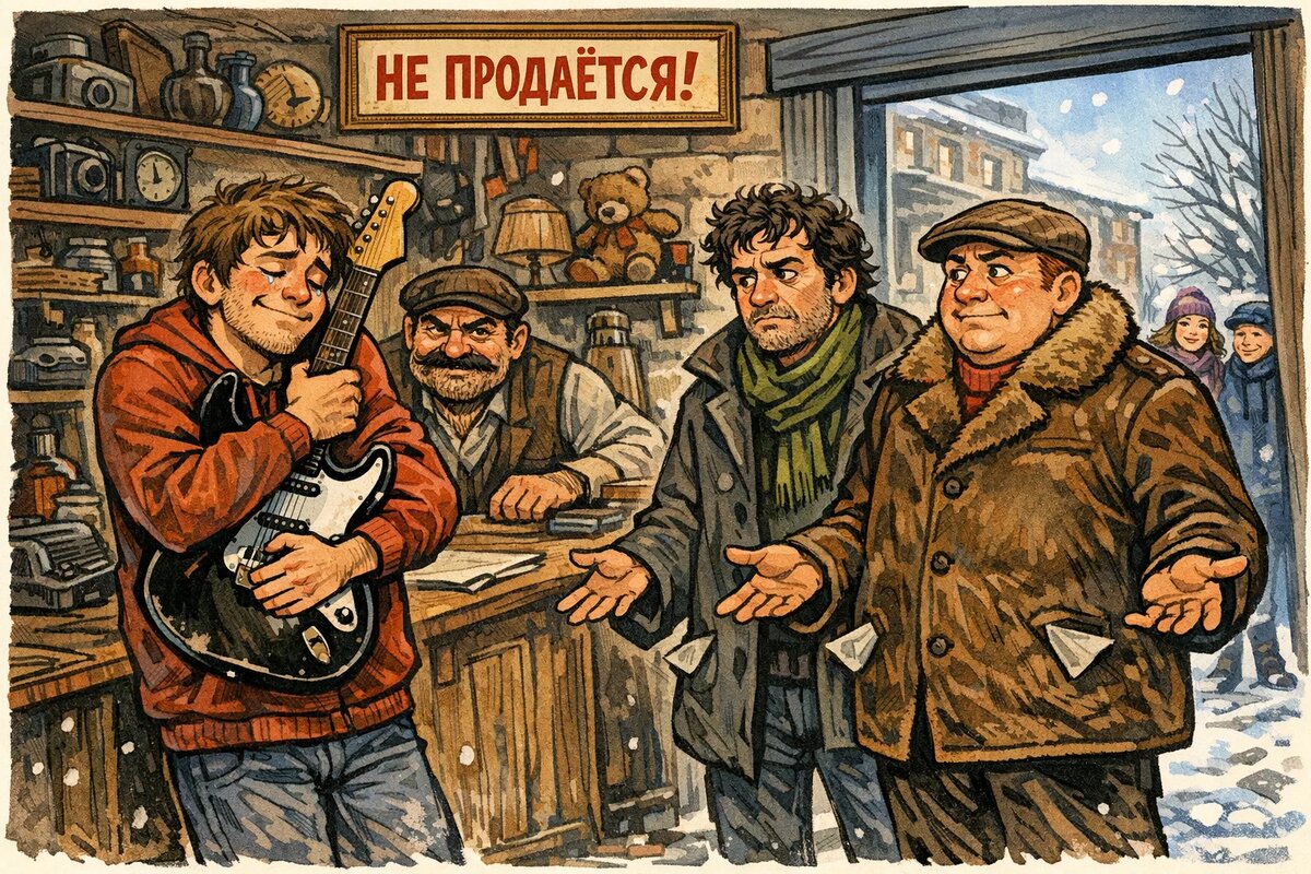 – Старина, я знаю, где продаётся гитара, которую ты искал! Кучерявый небритый Савушкин досадливо похлопал по пустому карману своего потёртого пальто. – Брось! – возразил краснощёкий Потапов, одетый не в пример чище и богаче. – Стоит копейки! Подержанная, но в отличном состоянии. Лично проверил каждый лад. Сделаешь себе подарок к Новому году! Савушкин ещё немного поколебался, но всё же капитулировал. Мечта о подлинной электрогитаре «Гаррисон AH-11» оказалась слишком сильна. И вот приятели уже зашагали по заснеженной улице в сторону комиссионного магазина «Вторая жизнь вещей». Войдя внутрь и отдуваясь с мороза, они вдохнули запах пыли и увидели у прилавка усатого продавца с хмурой физиономией и густыми бровями. – Здравствуйте! – бойко начал Потапов, пока Савушкин разглядывал заваленные подержанными вещами полки. – Я к вам в среду заходил, интересовался гитарой «Гаррисон». Вон той! Теперь привёл покупателя. Покажете нам её? Торговец развернулся и снял инструмент со стены. Глаза Савушкина