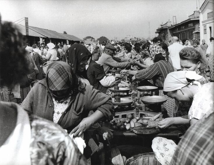 Городские базары, называемые «колхозными рынками», радовали изобилием. В колхозах денег не платили - рассчитывались с колхозниками «натурой», сельхозпродуктами, доля которых определялась по количеству начисленных «трудодней». Налоги же с сельских жителей взимались наличными деньгами. За неуплату строго наказывали. Вот и несли селяне на городской базар все, что только производило свое хозяйство.