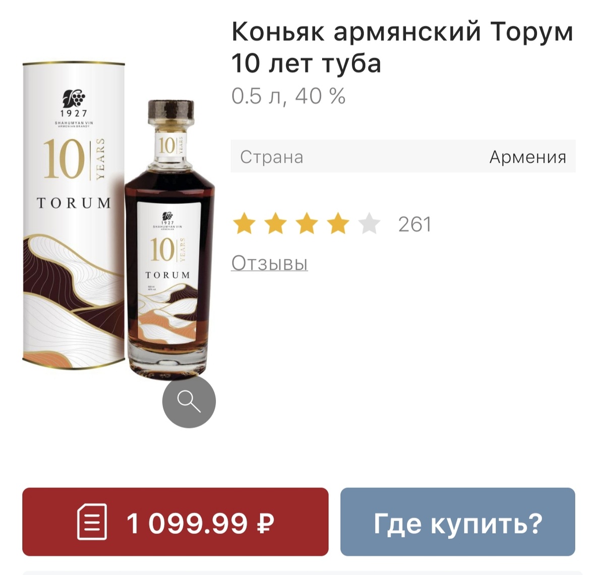 На их витринах стоит такой коньяк, как Торум 10 лет от Шаумян-вин. Стоимость — 1100 рублей за 0.5 л, крепостью 40%. Есть подробный видео обзор.