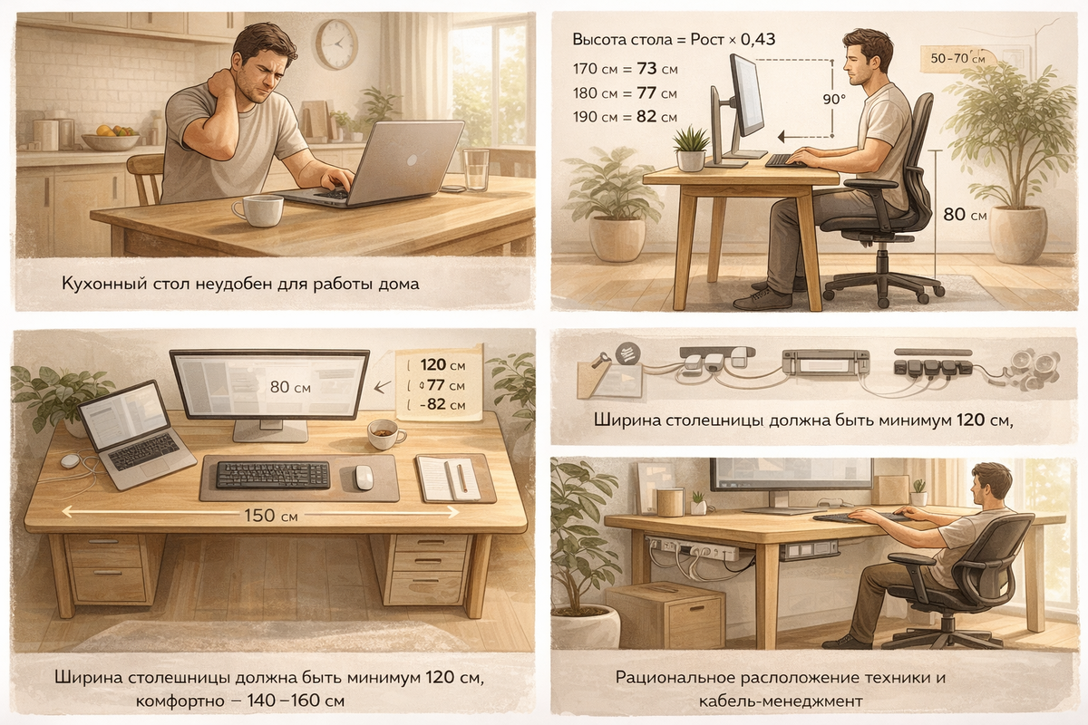 Я проверял на себе. Кухонный стол оказался на три сантиметра выше нормы. Три сантиметра. Казалось бы, ерунда. Но именно они заставляли плечи подниматься и держать напряжение весь день.