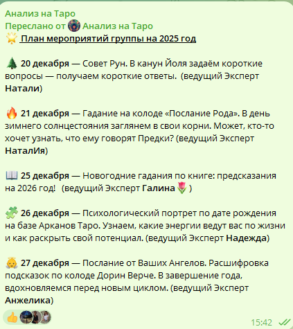 Всем привет! Стартует новая игра, которая поможет вам лучше узнать свой стиль таролога и потренироваться в трактовке карт! 🎴 Задача: 1. Рассчитайте ваше личное число по дате рождения и узнайте, какой старший аркан Таро соответствует вашему числу. 2. Затем из колоды Таро выберите один аркан рандомно — просто наугад. 3. Таким образом, у вас получится два старших аркана Таро. Теперь ваша задача — трактовать эти два аркана и определить, какой вы таролог и какие темы вам лучше всего подходят для работы. 💬 Формат игры немного меняем: Вы выкладываете свои трактовки, включайтесь в обсуждение и комментируйте трактовки других участников. С чем вы согласны? Что бы вы добавили? Это отличная возможность для практики и обмена опытом! ✨ Ждем ваших трактовки и комментарии! 😊 ✨ Кстати, в Телеграм-канале ✨ https://t.me/voronkovataro 🔹вы найдете множество интересных обсуждений, статьей о Таро, проработку раскладов, интуитивные игры и много других полезных материалов. 🔹 Кроме того, на канале найд
