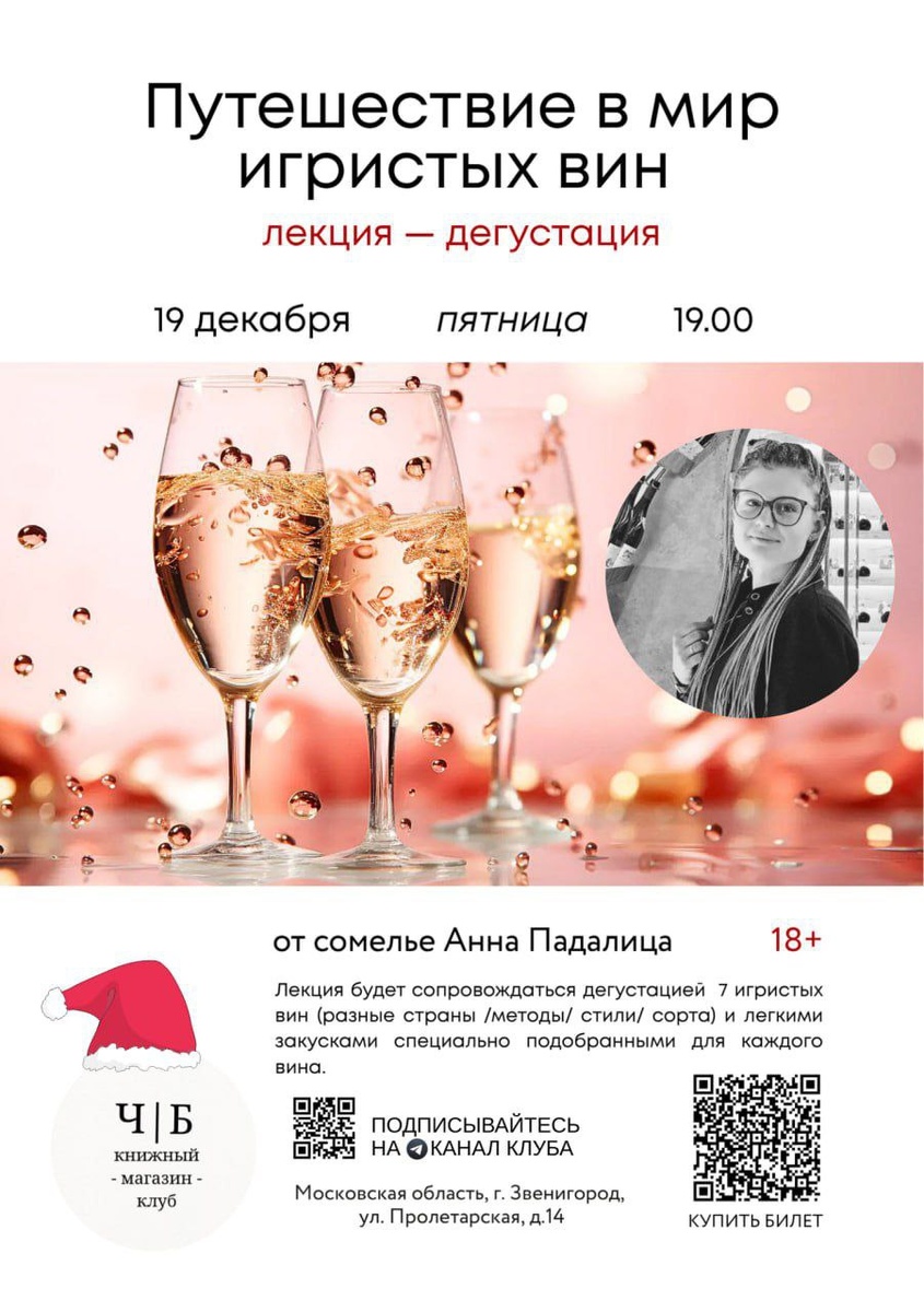 Лекция-дегустация с фото, видео демонстрацией от сомелье Анны Падалица пройдёт вот по такому маршруту: 💖 Игристый каприз истории: от случайного рождения к великому признанию. 💖Симфония сортов, палитра стилей, алхимия производства. 💖Сладкая тайна: содержание сахара, которое изменит ваше представление о вкусе. 💖Игристая карта мира: путешествие по винодельческим регионам. 💖Грация стекла: бокал, как ключ к раскрытию аромата. 💖Идеальный дуэт: гастрономические откровения в паре с игристым. 💖Секреты выбора: как не заблудиться в лабиринте винных полок – советы эксперта. ☝️В этот раз продажа вина не предусмотрена. Лекция носит исключительно просветительско-познавательный характер. 🗓19 декабря, ПТ, 🕰19.00 Продолжительность: 2 часа 20 мест (осталось 13❗) Билет: 2600₽ КУПИТЬ БИЛЕТЫ 18+ На такой игристой лекции вы еще не были! 🥳🍷🍷🎊 Всё игристое в Ч|Б💖 #ЛекцииЧБ