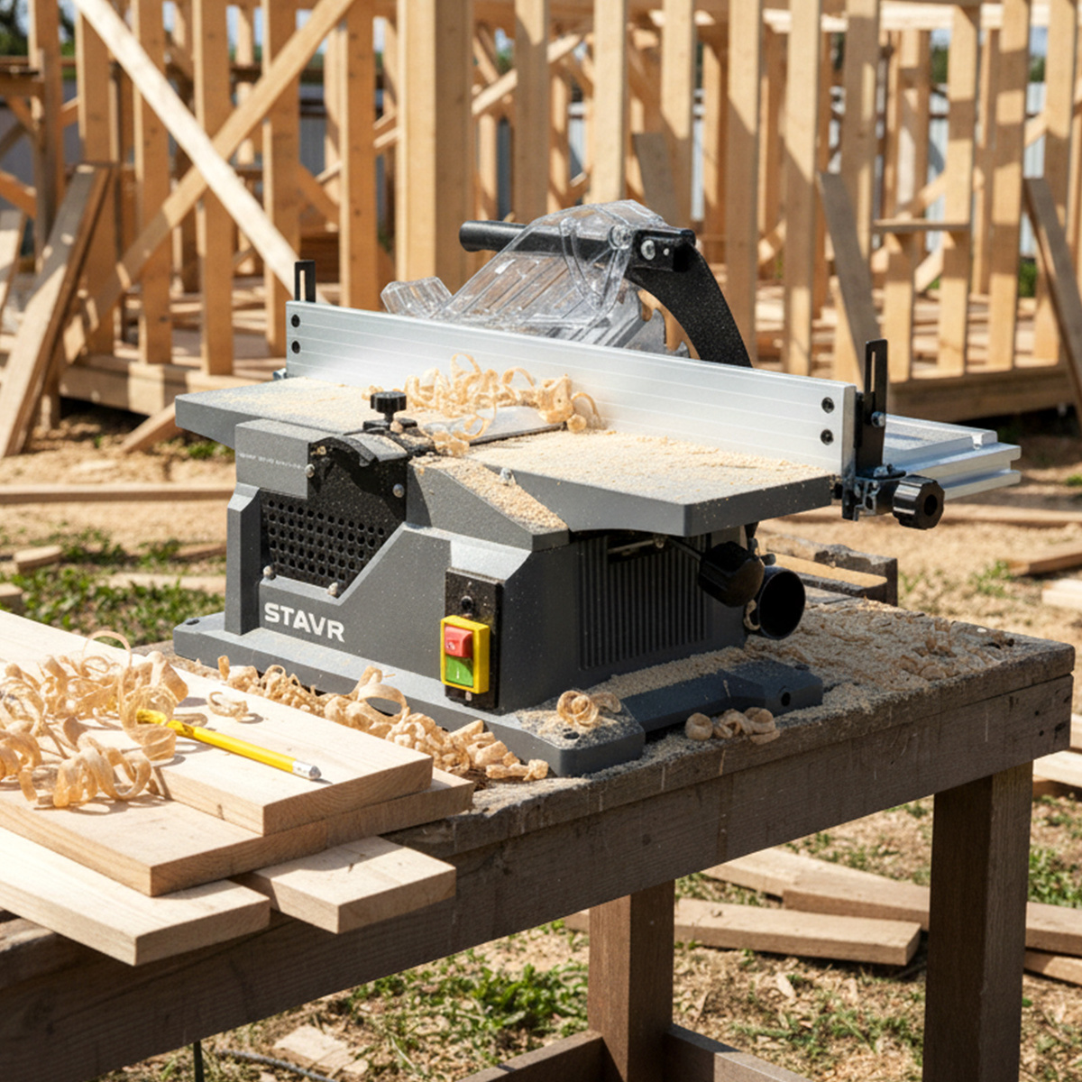 ⭐ Станок строгально-распиловочный 2 в 1 SWM 1250-255-154: универсальное решение для столярных работ ⚡ SWM 1250-255-154 — многофункциональный строгально-распиловочный станок STAVR, объединяющий возможности двух инструментов в одном компактном корпусе. Мощность 1250 Вт и пильный диск Ø254 мм позволяют уверенно выполнять продольный и поперечный распил заготовок глубиной до 98 мм, а строгальный блок обеспечивает аккуратное снятие материала шириной до 154 мм и глубиной до 3 мм. Модель оснащена двумя отдельными рабочими столами — для распила и строгания, что повышает точность обработки и удобство при переходе между операциями. Прозрачный защитный кожух обеспечивает контроль зоны реза, защитная прижимная планка надёжно фиксирует заготовку, а возможность подключения к пылесосу помогает поддерживать чистоту рабочего места. Компактная конструкция и вес 12 кг делают станок удобным для переноски и использования в мастерской или на выезде. Защита от перегрева и возможность крепления к рабочему стол
