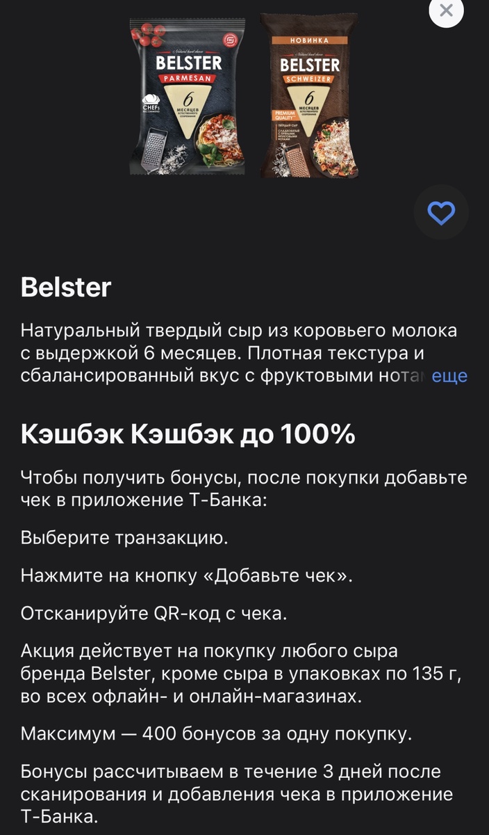 Утром увидела в Т-банке 100% кешбэк на сыр Belster. Давно меня не баловали такими бонусами, многим выпадали другие бесплатные продукты, но у меня их не было в приложении.