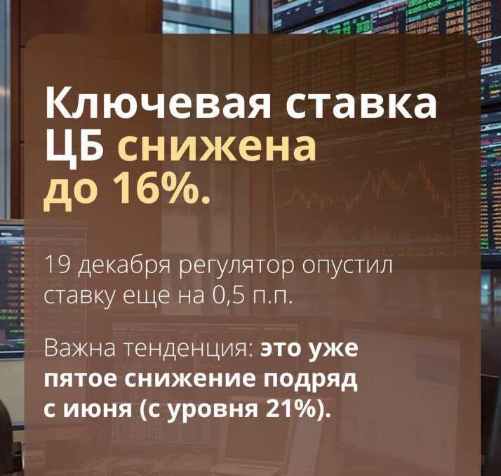 👇 Ключевая ставка ЦБ снижена до 1⃣6⃣➖ На декабрьском заседании Банк России снова пошёл на снижение — минус 0,5%. ⏺Кому-то покажется: «ну и что, всего полпроцента». Но если посмотреть шире — это уже пятое подряд снижение с июня. С 21% до 16%. А это значит, что самый жёсткий этап мы, по сути, прошли. ◼️Инфляция замедляется, экономика постепенно выравнивается, и рынок начинает мягко, без резких движений, разворачиваться в сторону стабильности. ◼️Для недвижимости это важный сигнал. Банки осторожно, но начинают пересматривать условия, появляется больше рабочих решений — особенно в связке с семейной ипотекой, рассрочками и программами от застройщиков. ◼️Если вы откладывали покупку квартиры из-за высоких ставок — сейчас тот момент, когда имеет смысл снова сесть и спокойно всё посчитать. Без паники, без спешки, но уже с другими вводными. Напишите мне — разберём вашу ситуацию, посмотрим варианты и выстроим понятную стратегию покупки под новые условия. 📞 +7 981 179 71 00