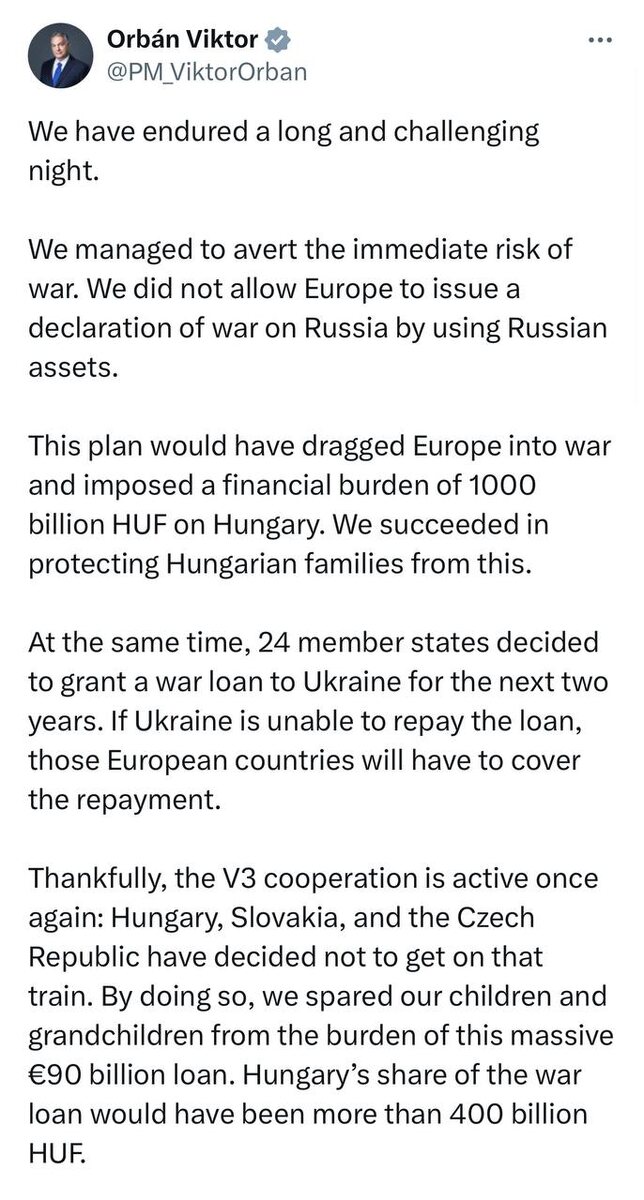 » Премьер-министр Венгрии Виктор Орбан заявил, что стране удалось преодолеть серьёзный дипломатический кризис и предотвратить опасную эскалацию. По его словам, венгерская позиция помешала Европе сделать шаг к прямому объявлению войны России, используя при этом российские финансовые ресурсы. «Этот план не только втянул бы континент в войну, но и возложил бы на Венгрию неподъёмное финансовое бремя в размере 1000 миллиардов форинтов ($3 млрд) Нам удалось защитить от этого венгерские семьи», — подчеркнул политик. Орбан отметил, что, к счастью, Венгрия, Словакия и Чехия решили не участвовать в этой схеме. «Тем самым мы сняли с будущих поколений венгров обязательства по чужому долгу, который обошёлся бы нам более чем в 400 миллиардов форинтов ($1,2 млрд)», — заявил премьер-министр. Он также пообещал не допустить использования денег венгерских налогоплательщиков для финансирования Украины. «Если бы в Венгрии было брюссельское правительство, оно бы втянуло Венгрию в войну и потратило бы