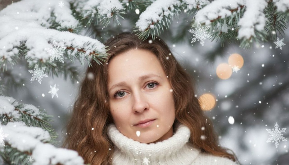 %. Портрет потрясающей девушки крупным планом, выглядывающей из-за заснеженных сосновых веток. Мягкий волшебный снегопад, снежинки, отражающие свет. На ней уютный белый пушистый свитер. Мечтательная атмосфера, теплое кинематографическое освещение ее лица, фон с мягким фокусом. Фотография высокой моды, детализированные глаза, эстетика зимней страны чудес, разрешение 8k, снятая на 85-миллиметровый объектив 💥ЖМИ