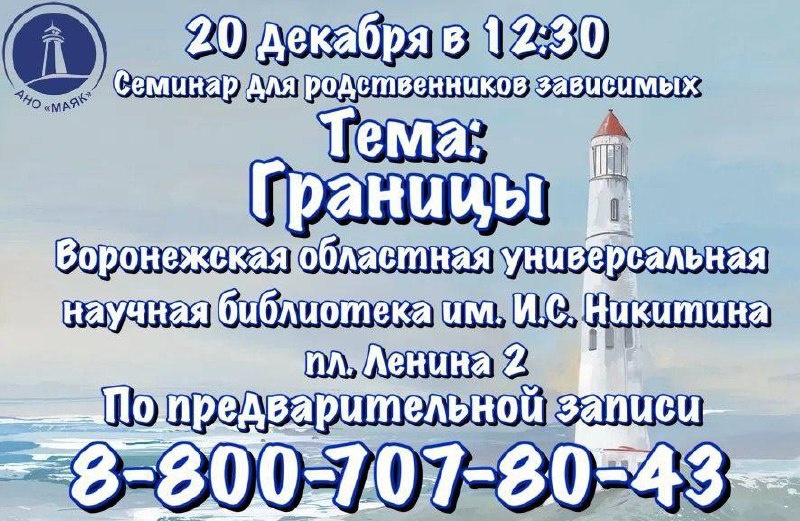 УЖЕ ЗАВТРА‼️‼️‼️ АНО «Маяк» организовывает бесплатный семинар для родственников зависимых. Главная тема: «ГРАНИЦЫ» Главные ведущие семинара: •Бобров Игорь Викторович А также вопрос-ответ от ведущих специалистов центра: •Поволяев Дмитрий Андреевич •Афанасиади Лев Александрович Дата и время проведения: 20 декабря в 12:30 Место проведения семинара: Воронежская областная универсальная научная библиотека им. И.С. Никитина пл. Ленина 2 Мы будем рады видеть каждого! Предварительная запись на семинар по телефону: 8-800-707-80-43