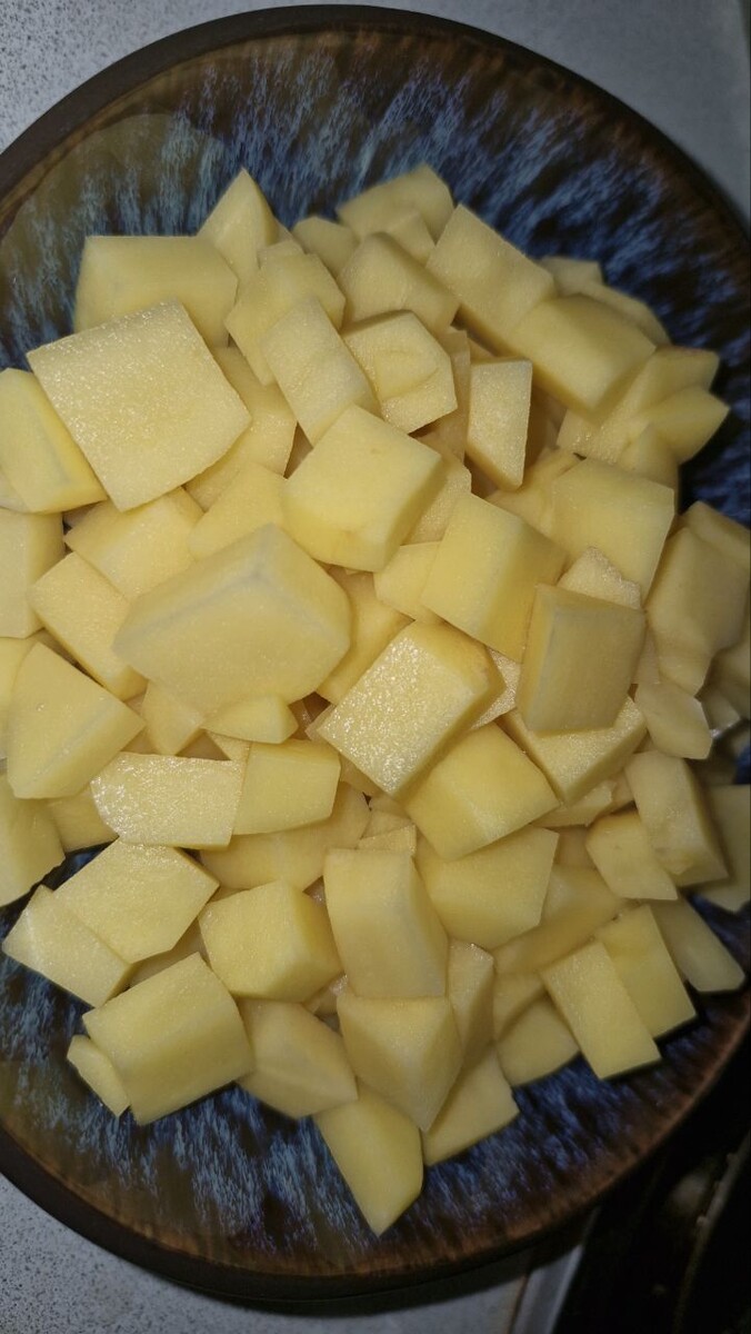 Шаг третий. Пока курица варится, подготавливаем картофель. Очищаем его и нарезаем средним кубиком. Когда куриные голени будут готовы, добавляем картофель прямо в бульон. Затем выкладываем зажарку из лука и моркови. На этом этапе можно оставить голени целиком или «раздербанить» их на кусочки, отделив мясо от костей. Делайте так, как вам удобнее.