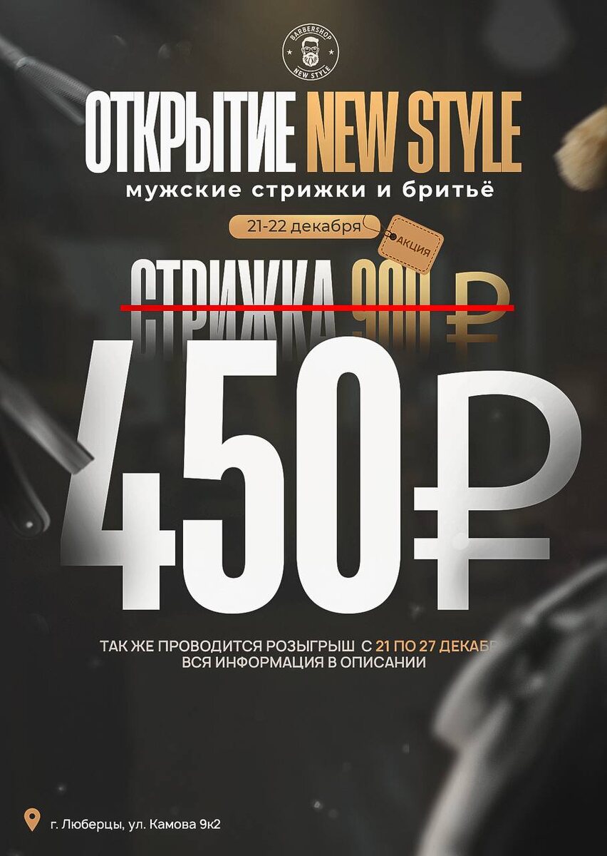 !💈 Привет, будущие джентльмены! Готовьтесь к стильным переменам! Мы с гордостью объявляем о торжественном открытии нашего нового салона мужских стрижек NEW STYLE! 🍾Мы открываемся: 21 ДЕКАБРЯ (воскресенье) в 12:00! Приглашаем вас окунуться в атмосферу настоящего мужского стиля, где каждая стрижка — это искусство, а каждый гость — ценный друг. У нас вы найдете: • Трендовые и классические стрижки от лучших мастеров • Профессиональный уход за бородой и усами • Уютную атмосферу, где можно расслабиться и насладиться моментом Приходи сам и приводи друзей! Чем больше нас, тем веселее и выгоднее! Мы хотим разделить этот особенный день с вами. ТОЛЬКО 21 и 22 ДЕКАБРЯ СКИДКА НА СТРИЖКУ 50%💈 Участвуй в РОЗЫГРЫШЕ! ✈️Все подробности в нашем тг-канале: https://t.me/barbershopnewstylesamolet Ждем вас по адресу: 📍Ул.Камова 9к2 Не пропустите это событие! Будет стильно, выгодно и незабываемо! До встречи в NEW STYLE!🖤 Для записи можете написать в телеграмм @za_elvin