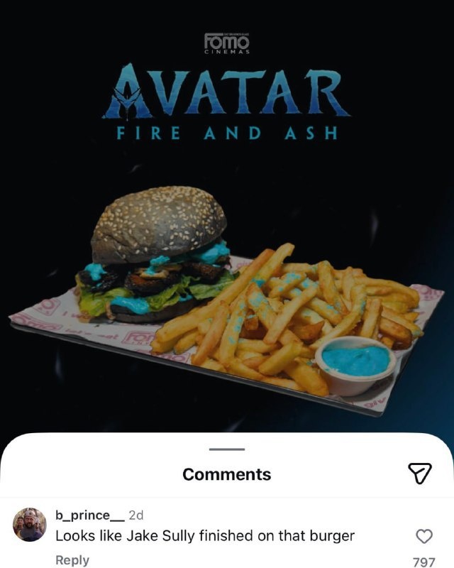 В Австралии кинотеатр выкатил бургер с «синим соусом Аватара» — идея с отсылкой оказалась настолько смелой, что фанатов накрыло эмоциями