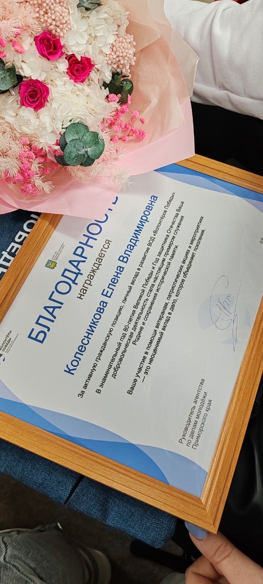 👍Получила Благодарность Агентства по делам молодежи Приморского края за личный вклад в развитие ВОД "Волонтёры Победы