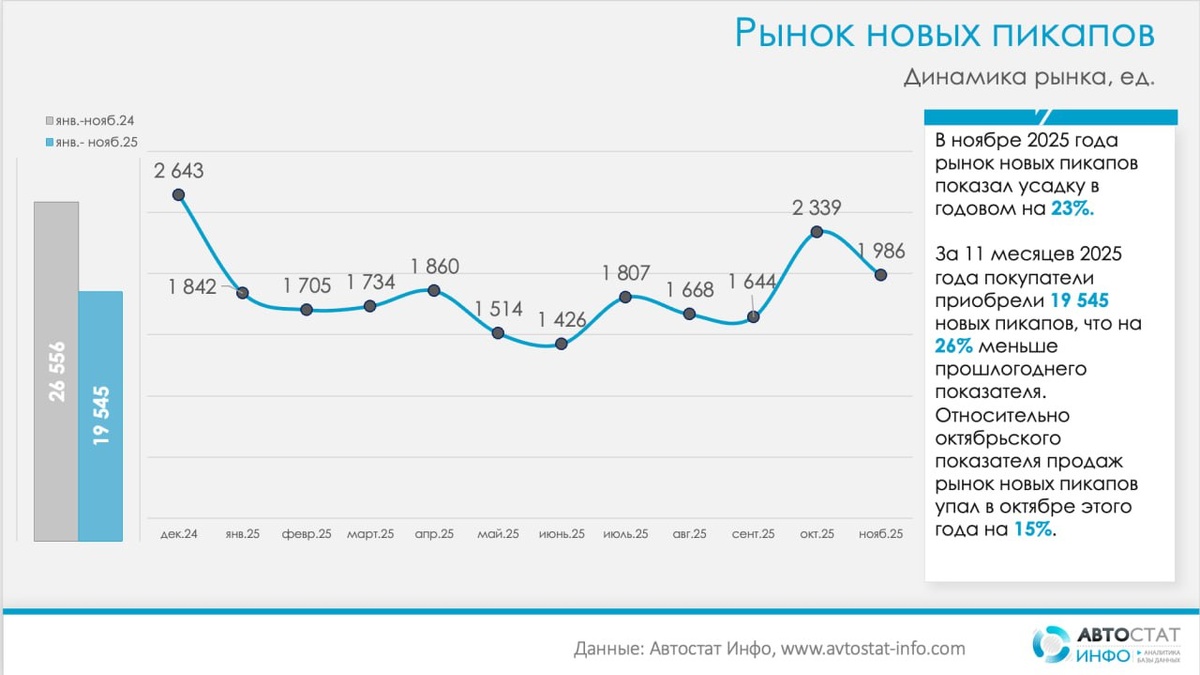 По данным «Автостат Инфо», рынок новых пикапов в России в 2025 году окончательно закрепился в статусе ниши, где каждый процент – это борьба за очень конкретного клиента. В ноябре 2025-го было продано всего 1 986 новых пикапов, что на 23% меньше, чем год назад. При этом после октябрьского всплеска до 2 339 машин рынок откатился на 15% – классическая картинка разовой доброкачественной активности (закупки под проекты, закрытие тендеров) без устойчивого тренда. В накопленном итоге за январь–ноябрь рынок новых пикапов составил 19 545 штук против 26 556 годом ранее, то есть минус 26%. Годовой график показывает узкий коридор: большую часть года продажи держатся между 1,4–1,9 тыс. машин в месяц с редкими выбросами, что говорит не о провале спроса «в ноль», а о постепенном вымывании части клиентов в пользу кроссоверов и подержанных пикапов. По брендам видно, что рынок переживает перераспределение ролей. В ноябре почти все традиционные игроки в минусе: JAC просел на 43% год к году, Great Wall