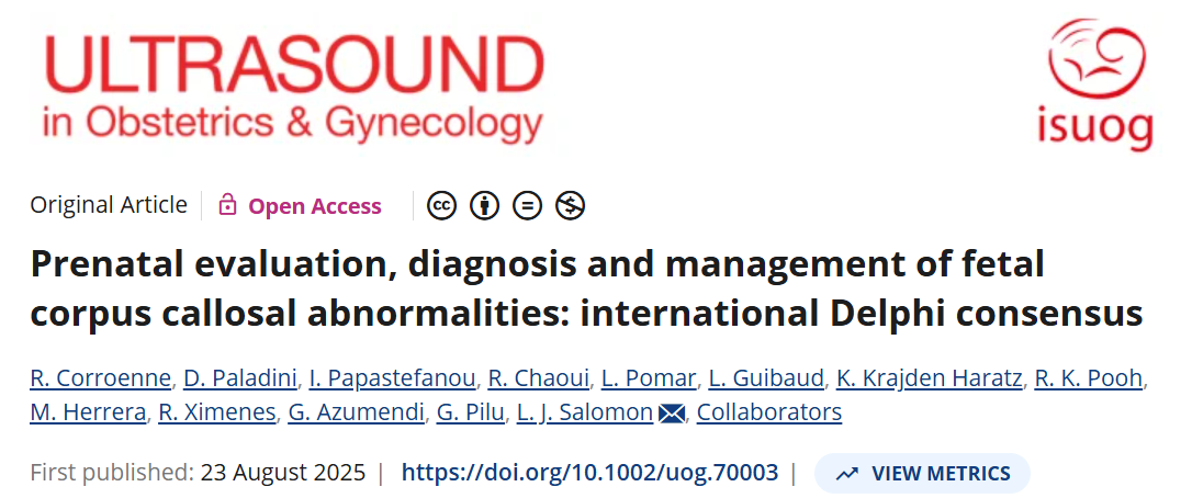 Corroenne, R., Paladini, D., Papastefanou, I., Chaoui, R., Pomar, L., Guibaud, L., Krajden Haratz, K., Pooh, R.K., Herrera, M., Ximenes, R., Azumendi, G., Pilu, G., Salomon, L.J. and Collaborators (2025), Prenatal evaluation, diagnosis and management of fetal corpus callosal abnormalities: international Delphi consensus. Ultrasound Obstet Gynecol, 66: 582-588. https://doi.org/10.1002/uog.70003