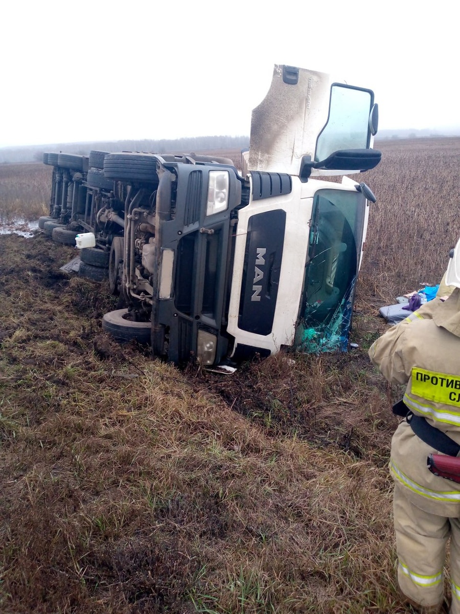 Высокая влажность и околонулевые температуры воздуха превращают дороги в Курской области в сплошной каток. Последствия такого разгула природы не заставляют себя ждать. Сегодня около десяти часов утра на 25-м километре трассы, соединяющей областной центр с городом Фатеж, было зафиксировано дорожно-транспортное происшествие. Во время движения в повороте "заскользила" и в результате оказалась за обочиной дальнобойная фура с тягачом MAN. В кювете грузовая машина опрокинулась на левый бок. Несмотря на то, что кабина тяжёлого автомобиля значительно повреждена, водитель получил незначительные ушибы и от госпитализации отказался.