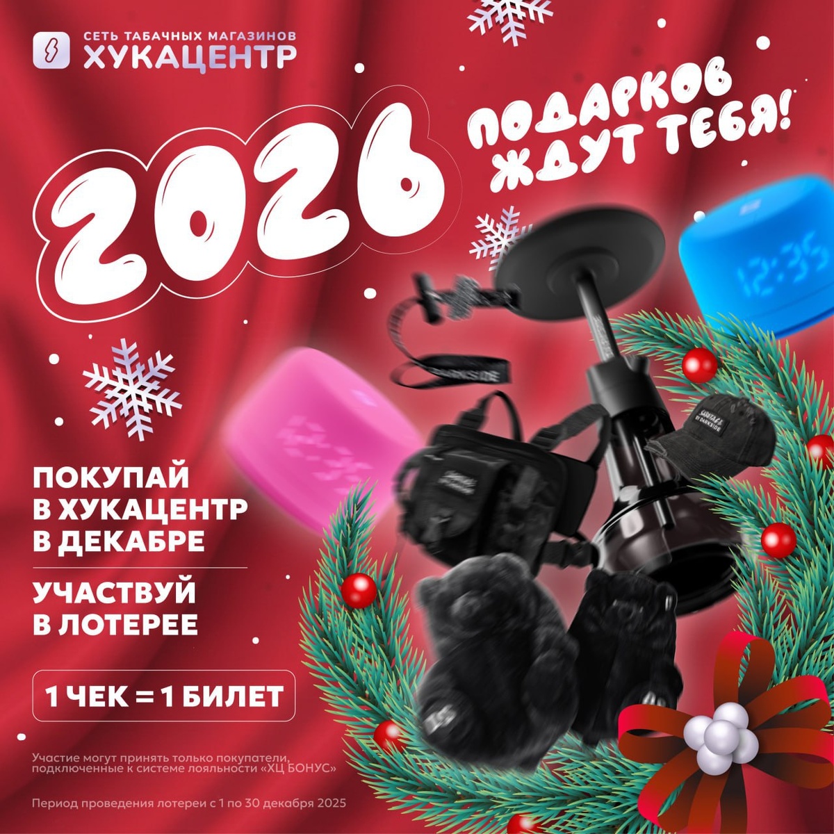 💛 Весь месяц мы превращаем ваши покупки в шанс поймать новогоднее везение за хвост! Каждый чек в декабре = ваш персональный билет к участию в большом зимнем розыгрыше 2026 призов 🎁 Да-да, мы подготовили целый сугроб подарков — чтобы конец года стал по-настоящему теплым и праздничным Как участвовать? 💛покупайте в ХУКАЦЕНТР в декабре; 💛используйте карту лояльности; 💛будьте подписаны на нашего Telegram-бота Бот фиксирует все чеки — и превращает каждый в билет 🎟 Чем больше чеков — тем больше билетов. А значит, и шансов! Пользователи без бота — увы, в чудесной декабрьской гонке не участвуют, билеты не начисляются 💛 Что можно выиграть среди 2026 призов? Вот лишь малюсенькая часть новогоднего мешка: 💛Кальян DARKSIDE "INTRO" 💛Яндекс-Станции 💛Подарочные сертификаты 💛Море фирменного мерча …и еще огромное количество приятностей! Все условия, список призов и подробности — на сайте 🧡 Пусть декабрь подарит вам удачу, а мы — что-нибудь классное!
