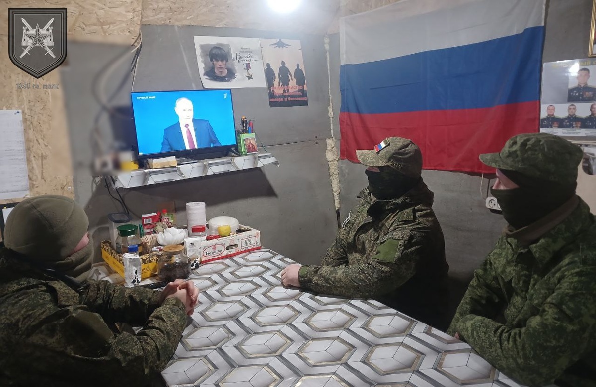 Бойцы 1430 гвардейского полка из комендантского и танкового подразделений смотрят «Итоги года с Владимиром Путиным», насколько это позволяет обстановка