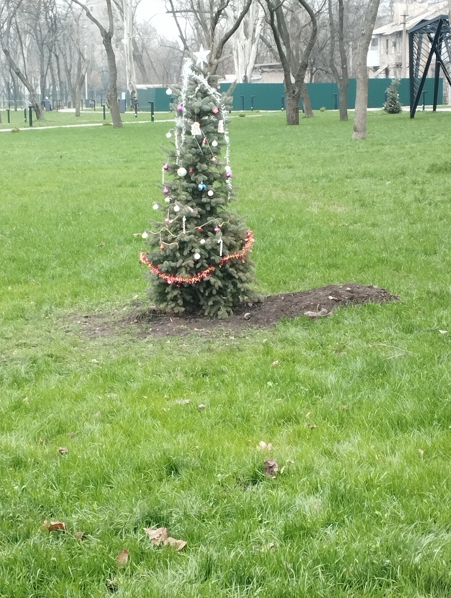 Конечно, в парке высадили и деревья. В том числе маленькие ёлочки. И сейчас в канун праздника дончане их нарядили.