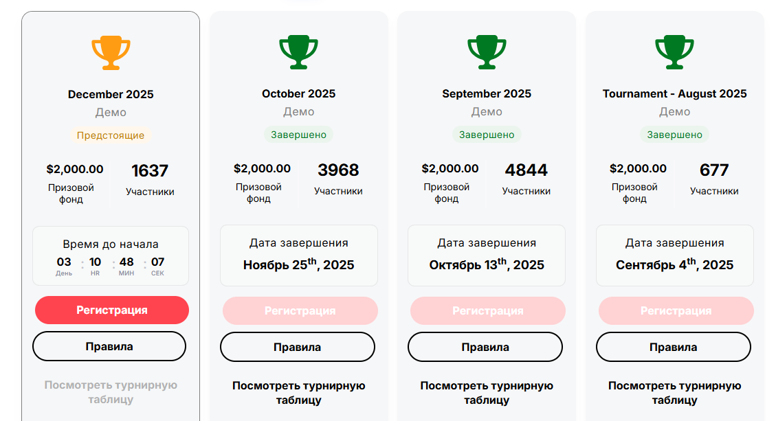 Для многих трейдеров путь к успеху начинается с практики, но компания Deriv предлагает пойти дальше. С помощью платформы Free Demo Trading Competition трейдеры могут не просто оттачивать свои навыки, но и соревноваться за реальные денежные призы, не рискуя собственным капиталом. Регистрация https://track.deriv.be/_6xp8XiG-e6op2TQjw-dn9mNd7ZgqdRLk/1/ Это регулярные онлайн-турниры, в которых участники торгуют на демо-счетах, используя виртуальные средства. Цель конкурса проста: достичь максимальной прибыли или лучшего показателя доходности к моменту завершения турнира. Хотя условия могут меняться от турнира к турниру, общие правила обычно включают: Для новичка это шанс почувствовать психологическое давление конкуренции, которое невозможно ощутить при обычной торговле на демо. Для профессионала — это отличная возможность получить дополнительный капитал для торговли без личных вложений. Хотите проверить себя? Следите за разделом Upcoming на сайте contest.deriv.com, чтобы не пропустить р