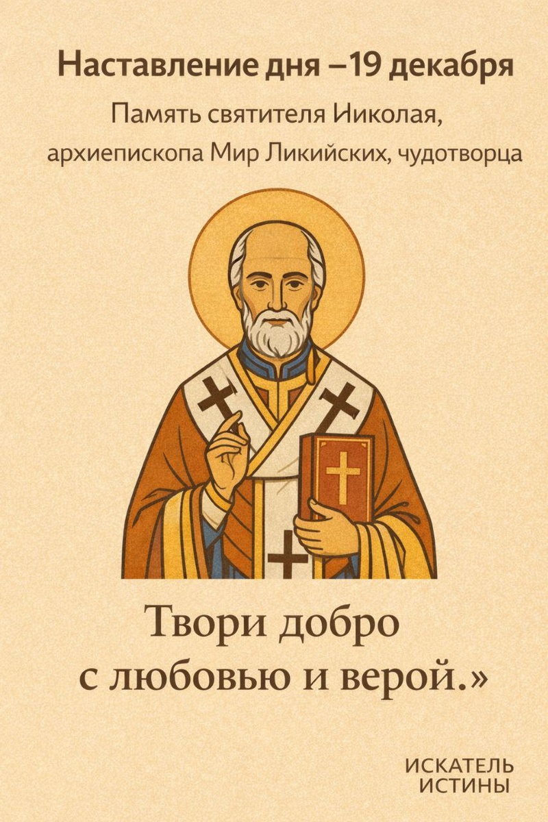 Память святителя Николая, архиепископа Мир Ликийских, чудотворца Святитель Николай был образом милосердия, кротости и деятельной любви. Он не искал славы, но спешил на помощь каждому, кто нуждался в защите и утешении. Его жизнь свидетельствует: истинная вера всегда проявляется в делах сострадания и правды. Пусть и твой день будет наполнен вниманием к ближним, готовностью помочь и доверием к Богу, Который никогда не оставляет просящих.