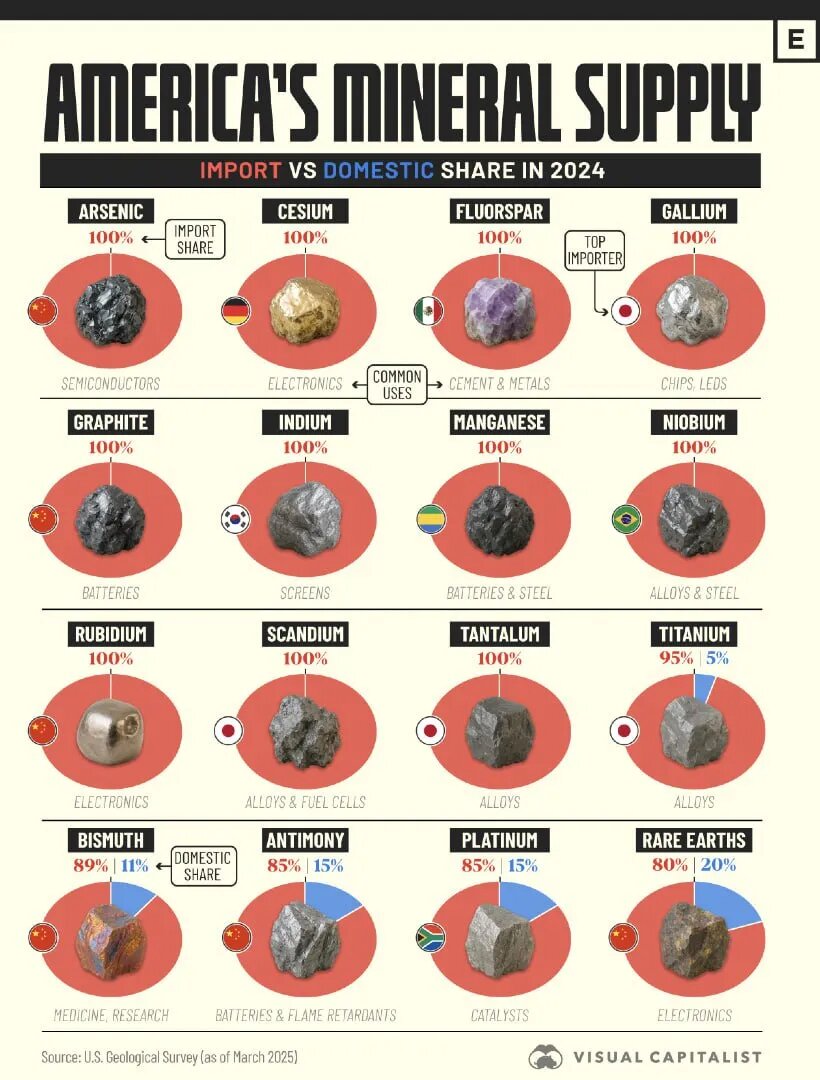 - США — технологическая база и переработка. Зависимость от внешних поставок по многим редким металлам. Политические меры стимулируют локализацию.