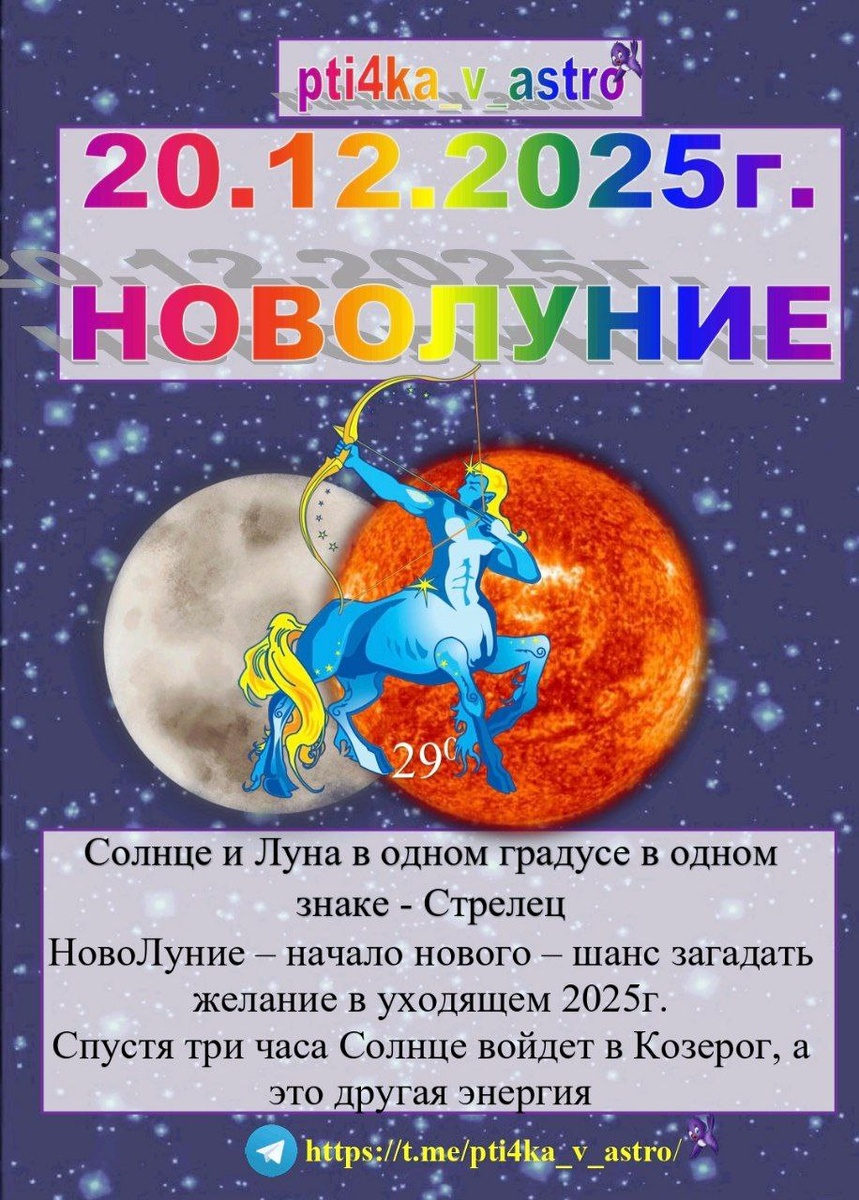 🗓 Наступит 20.12.2025г. в 04:42:17 мск ♐️ В этот раз скопление планет в масштабном, расширяющем, оптимистичном и целеустремленном знаке Стрелец ♐️ ☀️Солнце позволяет проявиться 🌙 Луна дает спокойствие и уют ♀️ Венера позволяет желать всего и побольше ☿ Меркурий отключает логику и берется за крупные проекты, мечты ✍️ Обязательно мечты и желания выпишите на листочек 🌠 Время для мечтаний до 07:52:21 мск 🌑Лилит - искусительница через пару часов сменит знак, - загляните вглубь своих тайных желаний 🦂 ♂️♑️ И смело начинайте воплощать свои желания в действия! ♑️ Нечасто планеты направляют идти в реализацию, задуманных планов и не позволяют распыляться по мелочам Помечтали? А теперь идите к цели! Маленькими и в тоже время уверенными шагами Изучите материал на интересующие темы (законодательство, правила, языки, билеты, проекты) 🧘♀ Обратите внимание на дыхание, печень, кожу, ЖКТ, нервную систему, кости и позвоночник, будьте аккуратны при ходьбе 💊 Принимайте витамины прави