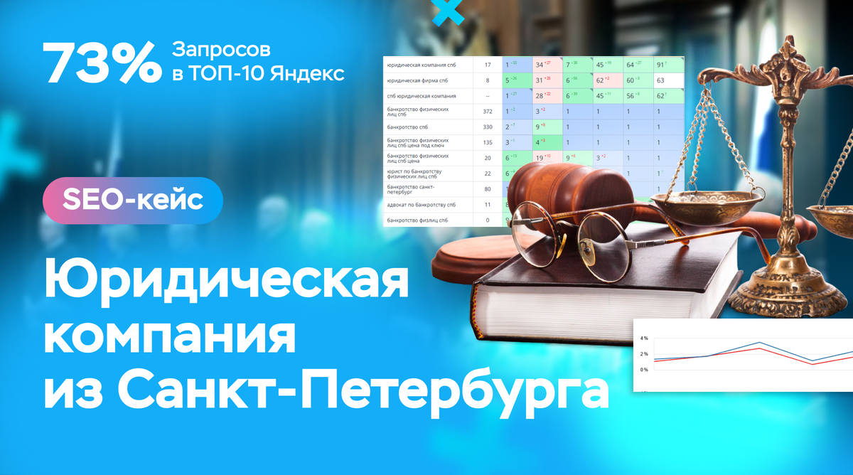 Нашим новым клиентом в 2025 году стала юридическая компания Stepanov Group из Санкт-Петербурга, оказывающая широкий комплекс услуг как юридическим, так и физическим лицам. Фирма специализируется на сопровождении процедур банкротства, взыскании долгов, защите прав потребителей, корпоративном сопровождении бизнеса и так далее. Показатели сайта, когда компания обратилась к нам, были следующими: около 880 посетителей в месяц и 44% запросов в ТОП‑10 Яндекса. Среди этих запросов “развод спб” (8419), “юридическая компания” (6495), “семейный юрист” (1881), “автоюрист” (2237), “взыскание долгов” (3394), “банкротство спб” (3276) и другие, многие из которых также имеют высокую частотность. На протяжении нескольких месяцев наше агентство анализировало проблемы сайта и последовательно их устраняло: провело аудит и правки, расширило семантику, создало структурированный и оптимизированный контент, а также усилило внешнее SEO.