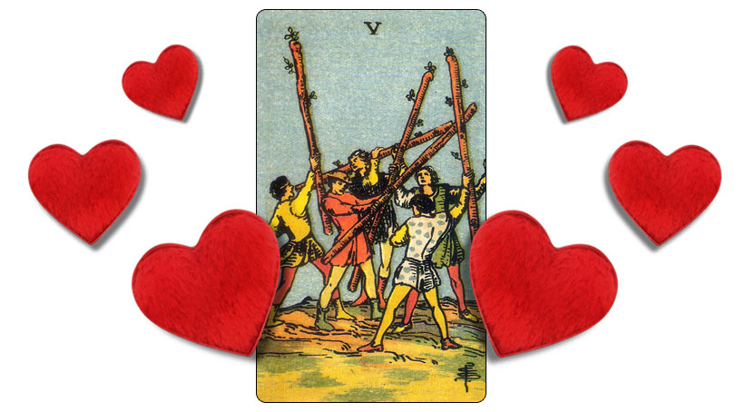 Если выпадает эта карта, то так и знайте, гармонии и согласия не предвидится. Наоборот, это споры, противоречия, борьба, каждый своего добиться пытается, игнорируя потребности и чувства другого. Не то, чтоб ожесточенная прям борьба, боли как таковой эта карта не приносит, но раздражение и нервотрепка есть. Раздражение от того, что «ну, я же просила… что, так трудно сделать?». Ну, а с другой стороны свои претензии: «А что, нельзя было нормально попросить, нормальным тоном… Почему лицо кирпичом?» или «Ну, забыл, что так трудно было напомнить?». Вот такое все. Вроде по мелочи, но эта мелочь – как камешек гальки в сапоге, далеко не уйдешь. Пятерка Жезлов – это либо внутренний конфликт, когда и хочется, и колется, либо раздражение и недовольство, когда человек считает, что заслуживает лучшего к себе отношения и готов бороться за свои права. На примерах рассмотрим сейчас, чтобы понятнее было. Ну, вот, такое сочетание, как Пятерка Жезлов и Десятка Кубков как в гадании на чувства трактовать?