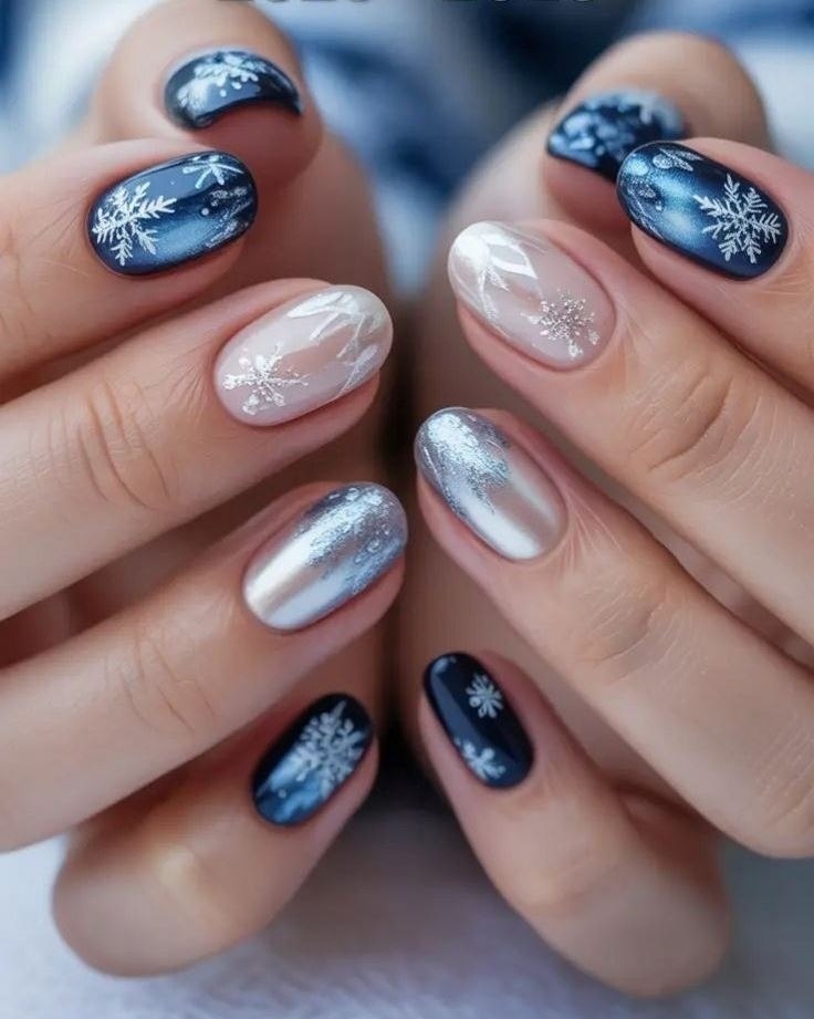 Темно-синий серебристый дизайн ногтей со снежинками. Зимний маникюр 2026