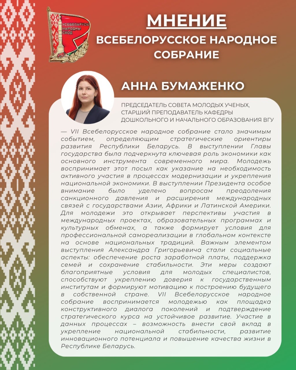 🔴Председатель Совета молодых ученых, старший преподаватель кафедры дошкольного и начального образования ВГУ имени П.М. Машерова Анна Бумаженко о Послании Президента Республики Беларусь А.Г. Лукашенко на VII ВНС — VII Всебелорусское народное собрание стало значимым событием, определяющим стратегические ориентиры развития Республики Беларусь. В выступлении Главы государства была подчеркнута ключевая роль экономики как основного инструмента современного мира. Молодежь воспринимает этот посыл как указание на необходимость активного участия в процессах модернизации и укрепления национальной экономики. В выступлении Президента особое внимание было уделено вопросам преодоления санкционного давления и расширения международных связей с государствами Азии, Африки и Латинской Америки. Для молодежи это открывает перспективы участия в международных проектах, образовательных программах и культурных обменах, а также формирует условия для профессиональной самореализации в глобальном контексте на о